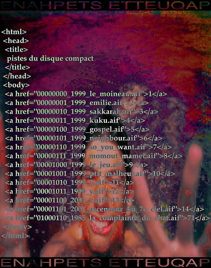 L'album bleu est la continuité de l'album noir dans le même genre alternatif mais plus épuré cette fois-ci. Il représente, en majeure partie, ma période la plus fertile, soit 1999. Mon pseudonyme était Enahpets Etteuqap. Oeuvre déposé à la SARTEC ©2002 puis retiré en 2007. Paroles de chansons Cliquez ici pour jouer à un jeu interactif tous en suivant les paroles de la chanson Le Jeu tiré de l'album. |